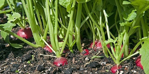 Radishes should be planted every 10 days to keep a continuous harvest going. The seeds should be sown one foot apart from each other. Radishes also have to be thinned every so often to keep a healthy crop. Water the plants generously throughout the week. If the soil is sandy, they will need more water. They should get at least an inch every week. You don’t want to have them get too dry because they can crack and become inedible. They can thrive in the fall and winter months, whether planted outside of inside, and should have plenty of sunlight wherever they’re planted.