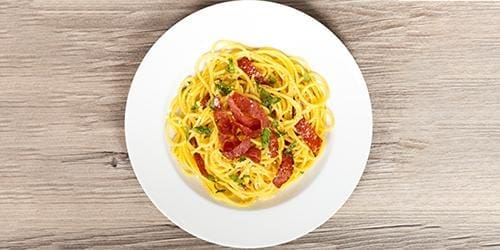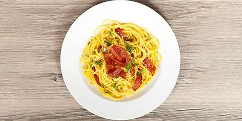 - Add hot pasta to the egg mixture, along with garlic and half the salami (already cooked). Toss, adding enough pasta water to coat pasta in a creamy sauce.