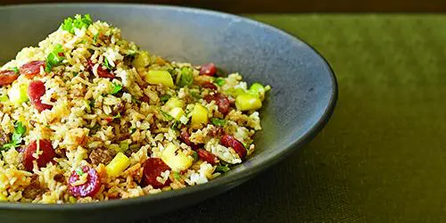 - Heat the oil in a large pan. Add the onion, sweet potato and ginger and cook over low heat, stirring, until the onion is softened for about 4 minutes. Add the curry powder and cook, stirring, for about 2 minutes. Raise the heat to high and add the beef jerky, tree ears and almonds. Stir-fry until heated all the way through. Add the rice and soy sauce and stir-fry to break up the rice and heat it through completely. Season with salt, stir it all together, and serve.