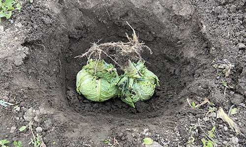Another option is to bury your cabbages beside a barn wall or outbuilding, so you know exactly where it is. Examine your stored cabbages frequently and take out yellowing heads and those that start to smell rotten. Just loosen the dirt around it and pull it out before preparing a meal.