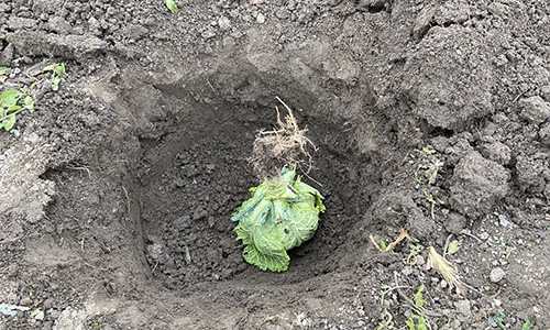 Cover the entire cabbage with approximately six to ten inches of mounded dirt − leaving a bit of the stem above the ground − but make sure to do so lightly at first to avoid warming.