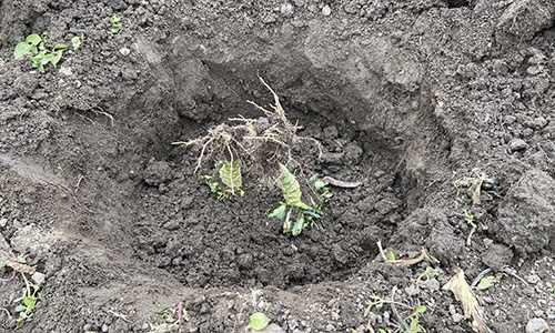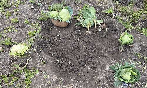 Dig a furrow of two to two-and-a-half feet in the dry ground or widen the hole where you’ve removed the cabbage.