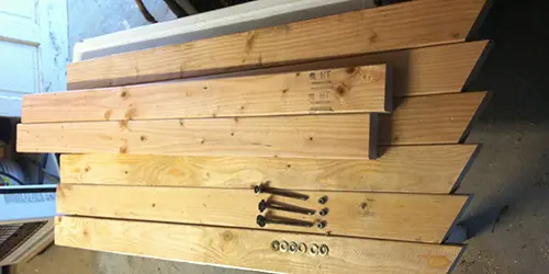 Step 4: Assemble the cross pieces by inserting bolts and washers through three pairs of boards. I used 2 washer on the outside and one in between each pair to help with folding the sawbuck for storage. The middle washer is not necessary. Tighten the nuts. You don’t have to torque the nuts too tightly. Just enough to hold and be able to easily fold the sawbuck when not in use.