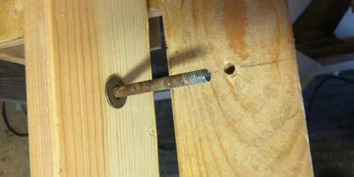 Step 3: Drill a hole in the center of each board on the line you just marked. The diameter of the hole needs to match the bolt you’re using. Use a drill press if you have one. If not, drill as straight as you can with a hand-held drill motor.