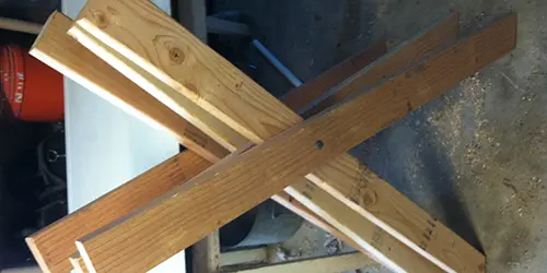Step 2: Measure 18 inches down from the square end and mark all 6 of the angled boards. This marks the spot for your bolts to hold the cross pieces together.