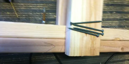 Lay your first brace on the 20 inch mark. Drive two screws (pre-drill holes) into three of the cross piece legs. You may want to pre-drill pilot holes to prevent splitting your brace wood. Use pressure treated wood if you’re buying lumber for this project. I used untreated because that’s what I had.