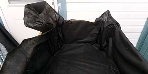 Then we added a layer of landscape fabric. The landscape fabric will help protect the wood from moisture a bit while allowing good drainage. Oh, and it keeps the soil from falling out through the chicken wire!