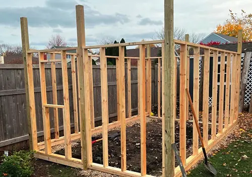 The front wall will include a door. The frame should be 6.5 feet high and 36 inches wide. Attach the door frame just as you did with the other walls, ensuring it fits securely within the 4×4 structure.