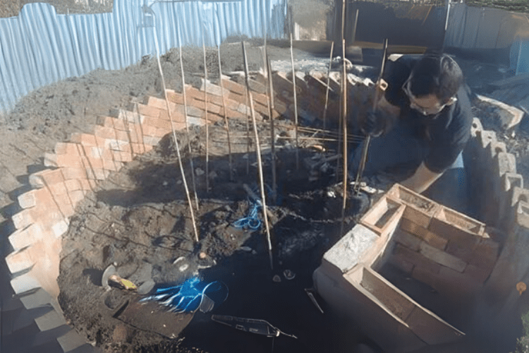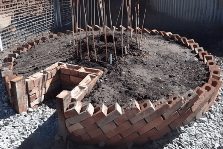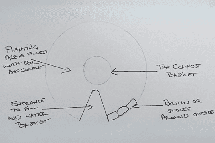 Soil is then placed around this central area and kept in place using stones or bricks. It is usually circular in form. When the garden is watered (by hand or when it rains) the central basket then leaches out nutrients from the compost to the rest of the garden.