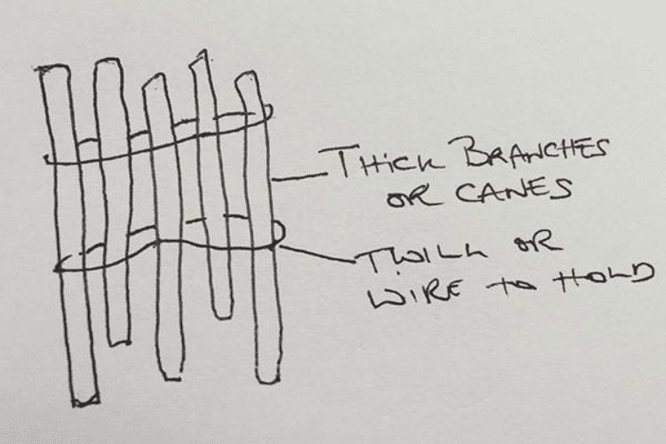 The rest of your canes will be used to create a circular basket. Place the canes in the middle of the keyhole garden circle, pushing them down into the soil to anchor them. Tie the wire or twine around them several times from top to bottom, to create the basket outline and hold the canes or sticks together.