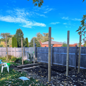 Polycarbonate panels would cover the frame, secured with screws and rubber washers. The first step was cementing 4x4s into the ground to mark the 10×16-foot perimeter.