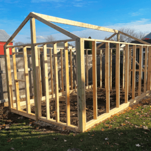 Next, I built the walls on the ground, then lifted them into place and fastened them to the base with large bolts, nuts, and plenty of 4-inch wood screws. I wanted it strong enough to handle the wind.
