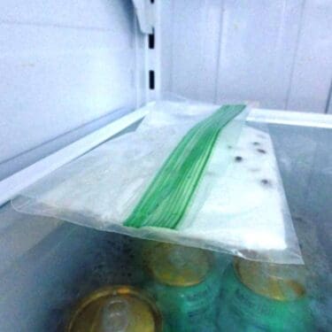 Leave the top of the plastic bag partially open and place the bag flat somewhere in the back of the fridge.