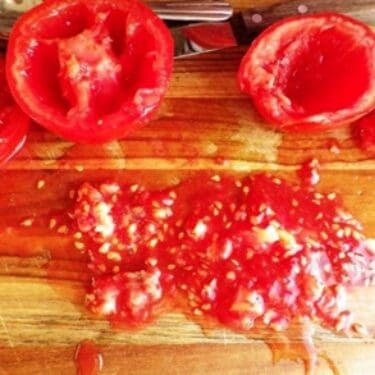 Cut the tomato in half and pull out the seeds and the gelatin surrounding them.