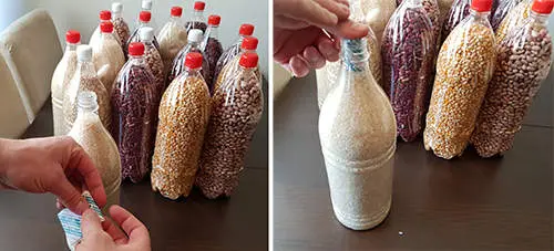 I made sure the bottles were clean and dry. I put the products separately, one by one, into big bowls and then took a cup and poured them in the bottle. For the beans, you should pour them slowly so that they don’t get stuck in the funnel.