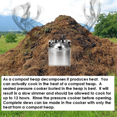 You may not be familiar with this concept, but the Amish have done it for centuries as well as our pioneer ancestors. The principle is simple. A healthy compost heap creates heat. It’s a by-product of the decomposition process. In many instances you can actually see steam emerging from a compost heap. You may also see it when you dig into it. That’s what you want to see. If you can feel the heat, you have a cooking option.