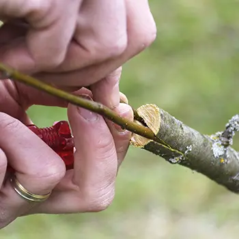 Trim your scion wood so that the end is at a point, rather like a pencil. You may choose to do this with a knife or with trimming scissors. Personally, I use pruning shears simply to make my cuts as exact as possible.