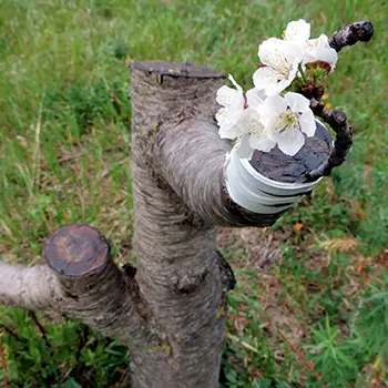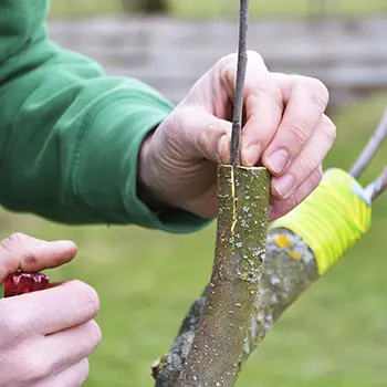 Have someone hold the freshly grafted tree in place and wrap the area in grafting tape. We prefer grafting tape to the old-fashioned twine method simply because it helps create a better seal. Once you’ve fully taped the grafted tree, cover the area with your favorite tree-sealing or “tree healer” medication. There are thousands of these on the market and many are area-relevant enough that we won’t make any specific suggestions. I simply prefer one that says it is waterproof because that means you won’t lose moisture from the plant and you deal with less potential rot at the grafting site.