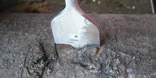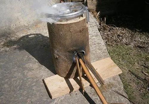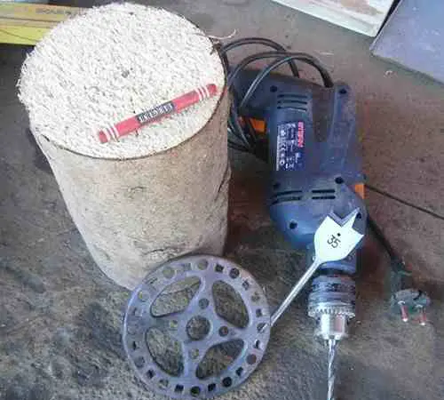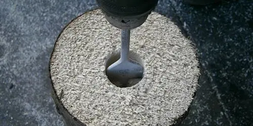 First, attach the drill bit to the drill and carve a hole on top of the log, drilling down as far as you can.