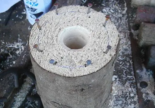 Based on the size of your stove’s burner grate, draw a circle onto the top of the log and hammer nails into the base, following the lines of the circle that were previously drawn. This will serve as our base for the grate.