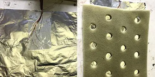 Cut the foam/sponge to size, and punch holes in it. I used a half-inch tube at 2-inch intervals. Place the sponge in the file sleeve and then place the two tinfoil sheets on either side of the foam. Larger holes spaced closer together will increase the pad’s sensitivity, while smaller holes spaced at larger intervals will decrease sensitivity.