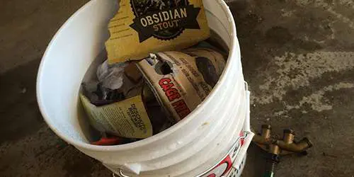 Place the holy bucket inside the other normal bucket. Start putting your papers, leaves, bio material in it. Add your water and fill’r up. Doesn’t really matter if you have too much water. You can leave these buckets of water setup by the mailbox, then just walk by and toss stuff in.