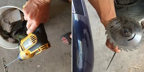 You need a custom drill bit, which I have. A good thing to do is find an old table saw blade and weld it to s shaft of steel. This is “the hardest” part of this setup. Drill away and in seconds you will have a nice pulpy wet mess.