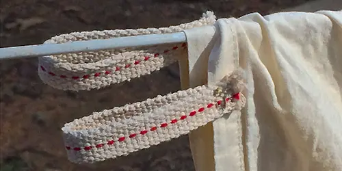 Sew the lamp wicks on all corners and at two foot intervals along the edges. I sewed these on by hand. A sewing machine would take less time but that’s how I roll. I added 3 additional loops down the center of the sheet to allow for more options when configuring my tarp.