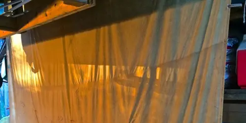Hang the oiled sheet vertically under a covered roof outside. In a hurry, I laid my sheet over the double clothes line. This method created two lines down the middle section of the sheet. Plus, it rained that evening. Dumb move. The next morning, water was standing on the sheet between the two lines. I hung the sheet under my attached shed behind my shop the next day.