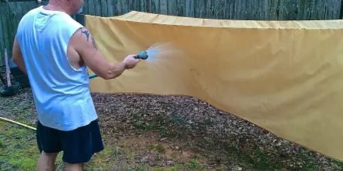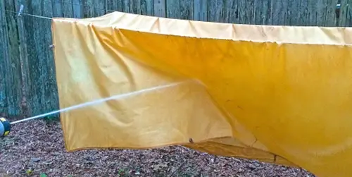 I hung the dried tarp on the clothes line and unreeled the garden hose. I set the nozzle on “shower” and pulled the trigger. This was my common rain shower test. It passed! No moisture behind the tarp when wiped with a paper towel.