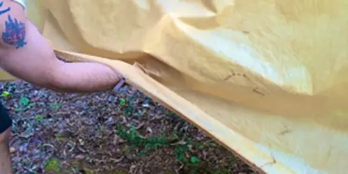 Worried about burning down your shop or barn while the tarp hangs to dry? Don’t be. Spreading the tarp to dry dissipates the heat.
