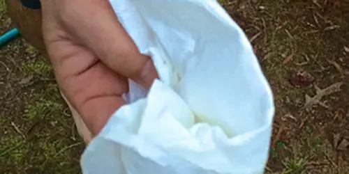 Mix equal parts boiled linseed oil and mineral spirits (drying agent) in a container. I used a 5 gallon bucket. You only need enough to completely saturate the cloth. I used two cups of each and found dry spots on the sheet. Another cup of each did the trick. Other DiY’ers have “painted” the oil on their cloth. For the best coverage, message the oil into the material in a bucket. You’ll probably want gloves for this step.