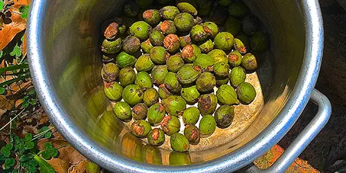 I filled the bottom of a 10 inch pot with green hickory nuts from a tree in our yard. Thank you, squirrels! Use an old pot that you don’t mind staining. I then added several black walnuts (green hulled) to the mix which happen to be dropping from trees now.