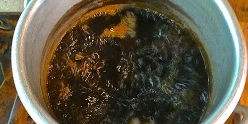 With the dyeing agent (green nuts) in the pot, fill 3/4 full with water. Bring to a boil on an outdoor fire. Allow to slow boil for an hour or more. The longer you boil, the darker your dye will become. I was going for an earth tone.