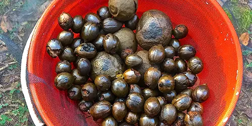 You can also break the green hulls off the black walnuts to increase the surface area and improve the extraction process. Be aware that the hulls will stain anything they touch – skin included.