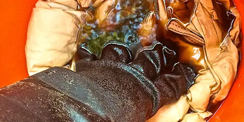 Place the sheet into the container. Use rubber gloves to prevent staining your hands. Turn and squeeze the material for a thorough coverage.