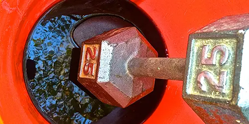 Leave the sheet in the dye for 24 hours. Longer for a darker color. To keep the sheet submerged, I place the lid of cast iron dutch oven on top. Not recommended. The greasy drip spikes on the lid left a polka dot stain pattern on the bed sheet. What was I thinking!? I replaced the heavy lid with one of DRG’s small dinner plates and a 25 lb. dumbbell.