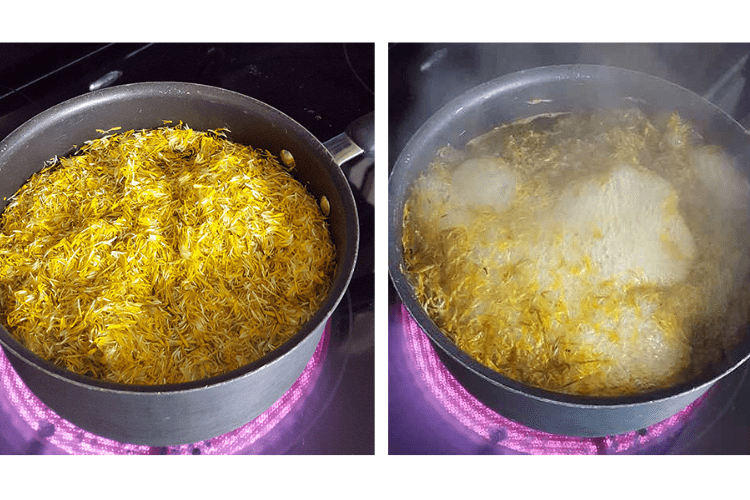 Long method: Pour two quarts of boiling water over four cups of dandelion petals and allow to sit for two to twenty-four hours.