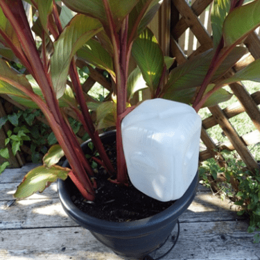 This is a great solution for potted plants. The size of the bottle should be proportionate to the size of the pot or container. For small pots and hanging plants you could use a 12-ounce bottle. For larger pots and containers, you could use up to a 1-gallon jug.