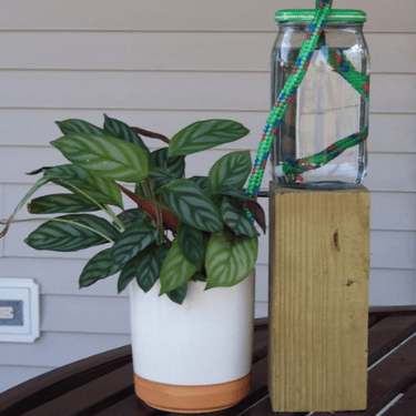 The size of the bottle and the amount of water depends on the size of the plant container, but it can keep a houseplant watered while you’re not home. What’s important is that the bottle of water be above the level of the plant. That will allow gravity to help wick the water from the jar to the soil in the pot.