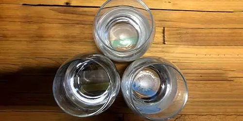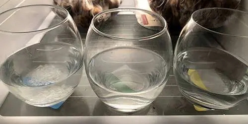 The below images show three samples of water. I have added copious amounts of sodium chloride to one solution, and magnesium sulfate to the other. The third is clean tap water. I then place them in the freezer overnight.