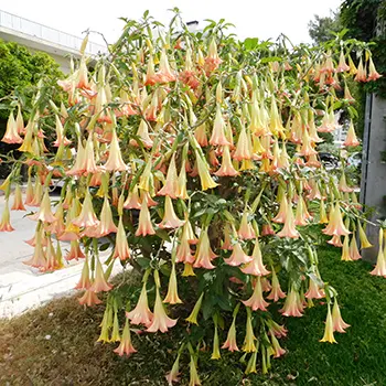 Angel’s Trumpet is a bell-shaped flower that is popular in gardens. Considered an annual Shrub, this plant can grow up to 20 feet high. Angel’s Trumpet comes in orange, white, pink, and yellow. This plant blooms in spring, summer, or fall and is known to keep deer at bay.