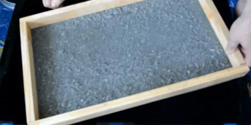 - Slowly lift the frame out of the water, looking to see, as the water drains out, that the shredded newspaper pulp is evenly spread across the entire are of the screening.