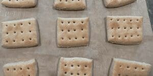 Mix your ingredients in a large bowl until fully incorporated. Go ahead and tip the mixture out onto a floured surface and roll it to around 1/2″ thick. Cut your hardtack into 12 separate pieces, prick each several times with a fork to prevent bubbles, and place either on a baking sheet (sprayed heavily with a non-stick cooking spray) or in your campfire cooking container.