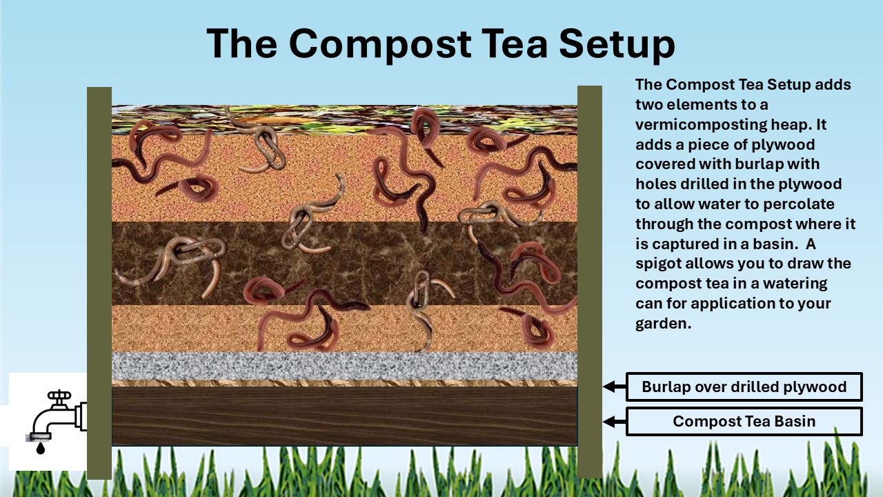 The whole idea is to allow the water you add to your vermicompost heap to percolate through both the layers and the worm tailings. The addition of a sheet of plywood at the bottom of the heap with holes drilled and a layer of burlap allows the compost tea to drip into a tub. A spigot on the side of the tub lets you tap it when you need to give your plants a good dose of nutrients. Here’s a cutaway of how it works.
