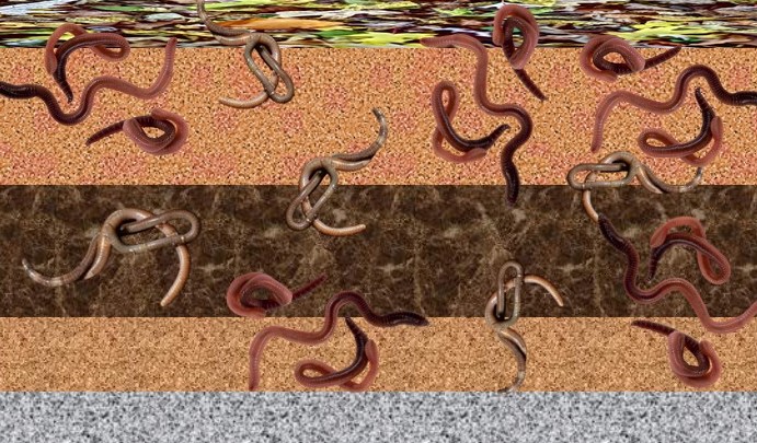 The layers consist of a combination of materials including rocks and gravel topped by a layer of sand, topped by a layer of peat moss or wet leaf litter to hold moisture followed by a layer of compost materials like green plant trimmings and manure and finally a topping of dry leaf litter and dead plant stems. Here’s a cutaway view with the worms wiggling throughout the layers.