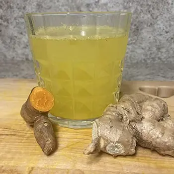 - Wash a thumb-sized piece of ginger, keep the skin on, and cut it into slices.