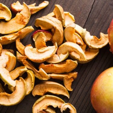 For this recipe, the food dehydrator is best. Any variety of apple will work. It’s best to peel them, core them and then slice them thin about 1/8 of an inch. It’s also important to soak the apples slices in either lemon juice or vinegar. Apples often oxidize and turn brown and a treatment with lemon juice or vinegar will prevent them from browning while they dry. Layer them around the dehydrator tray and turn it on. It usually takes 3 to5 days for the apples to dry. Check on them daily and take a bite to assess doneness. Store in a mason jar or a Mylar bag. Keep refrigerated and they should be good for up to 3 months.