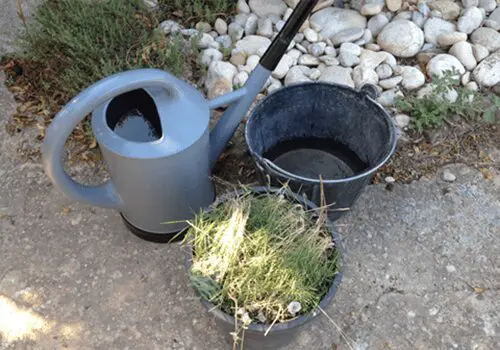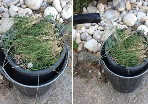 With your pot of vegetation sitting in the bucket, fill the bucket with water.